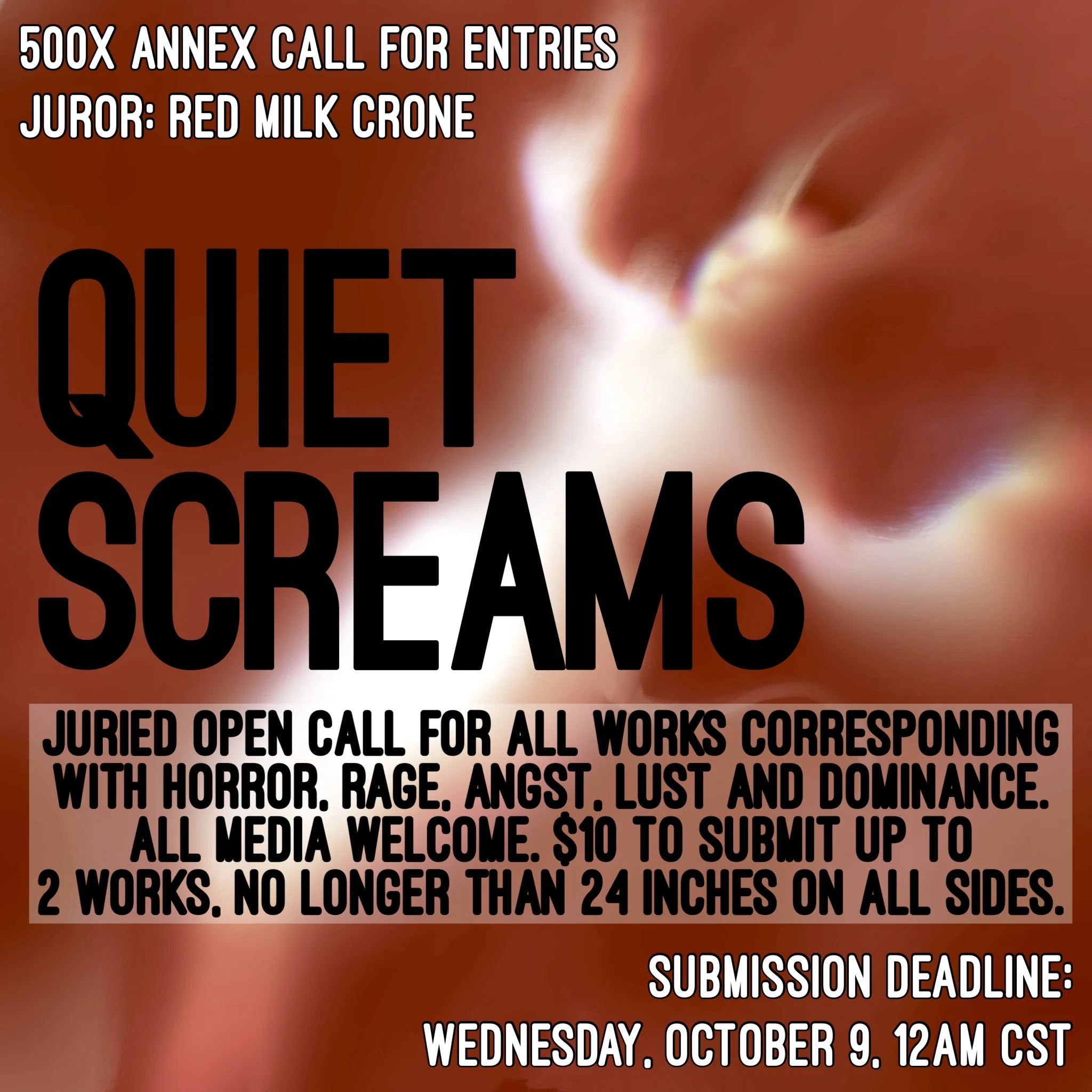 500 Annex is happy to announce our upcoming juried exhibition, ‘QUIET SCREAMS’! The juror for this exhibition is 500X member and multi media artist @redmilkcrone! For this exhibition we are looking for works corresponding to horror, rage, lust and dominance! All types media will be considered! The entry fee is $10 and each entrant is allowed to submit up to two works that are no larger than 24 inches on all sides for consideration. We welcome all artists residing in the DFW area age 18 and over to apply!